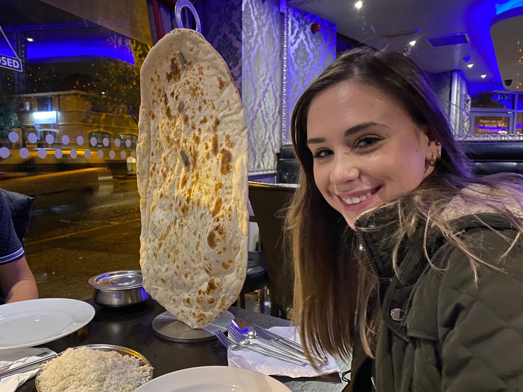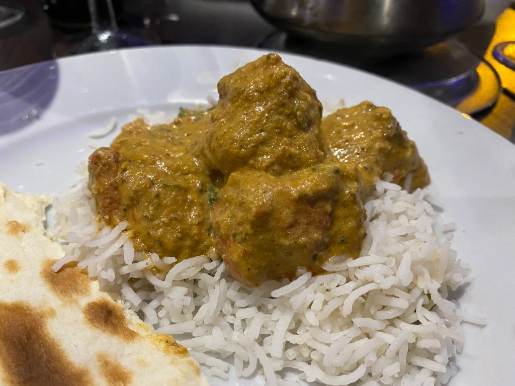 A Naan twice the size of Emily’s head came out skewered on a hook. Bowls filled with a variety of curries: Butter Chicken, Lamb Rogan Josh, Chicken Korma. Chunks of meat bathing in thick sauces. We spooned the sauces onto beds of rice, ripped of chunks of the Naan, and used it as a vessel for the curry.