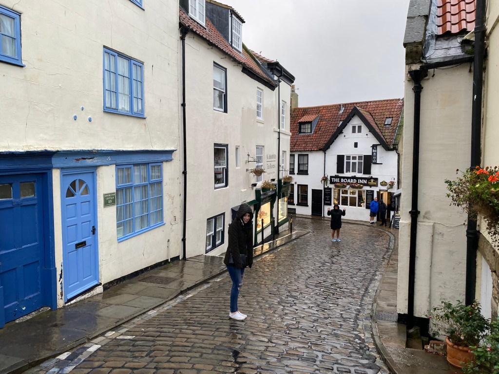 Whitby is a beautiful, typical Yorkshire seaside town. The strong ocean smell immediately filling your nostrils. Seagulls constantly screaming. Flashing lights and beeping from arcades filling every corner. Fish and chips wrapped in newspaper, people eating them with a small, wooden, 2 pronged fork. Brick buildings and cobbled streets. People eating soft serve ice cream with a flake (A 99) even though its freezing outside. Pasty Englishmen walking around shirtless with beer. What an experience.