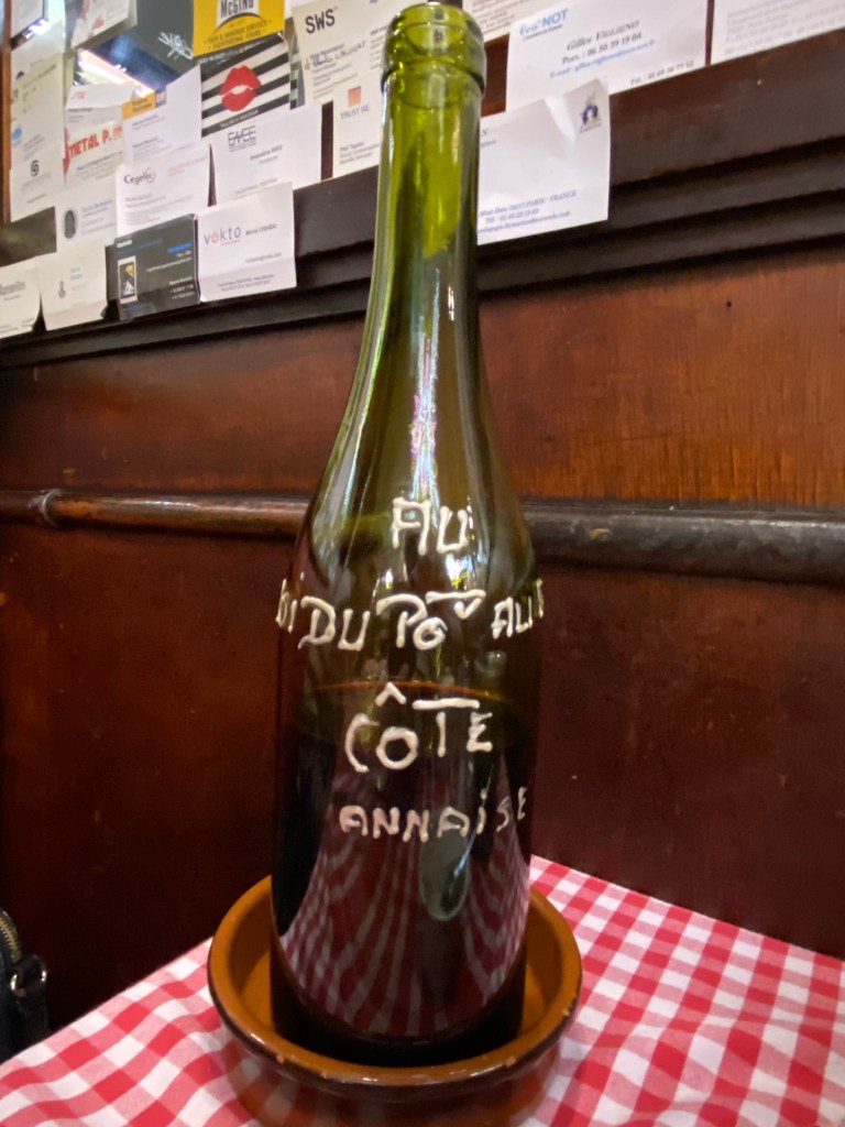 Inside was a single waiter standing behind the bar who barely spoke English. He daintily directed us to a table and took our order: 2 servings of Pot au Feu. On the table was a bottle of wine, free of charge. This was real experience we were searching for.