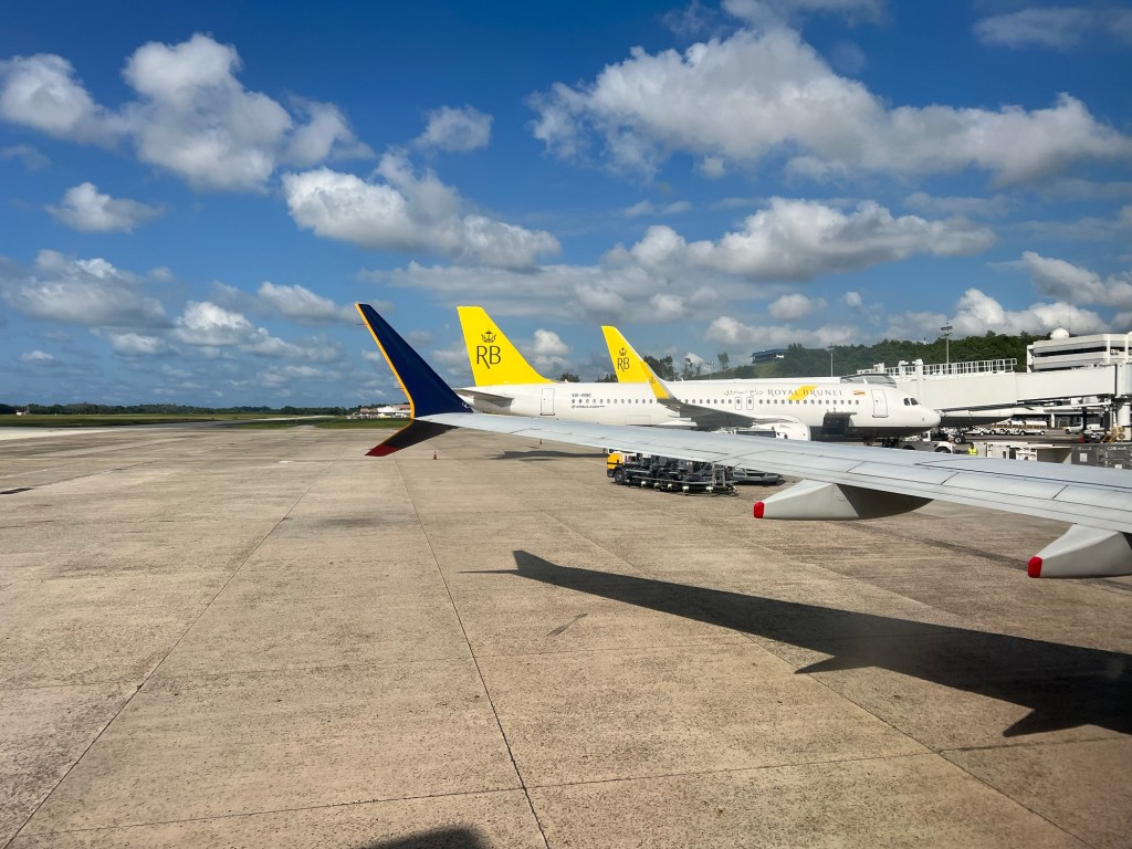 We got to our gate early and waited for it to open. The gates here were completely enclosed and locked until 30 minutes before boarding. Once they opened, everyone lined up and went through security inside the gate. It was a pretty quick and efficient process. Once through, everyone sat in the enclosed gate until it was time for boarding. Looking back at the demographics of our flight to Singapore against this one was pretty funny. We were clearly the only tourists on the flight. It made sense though, considering Brunei is one of the least visited countries in the world. Before the pandemic in 2019, only 333,244 tourists visited the country by air, and that number has significantly decreased since COVID.