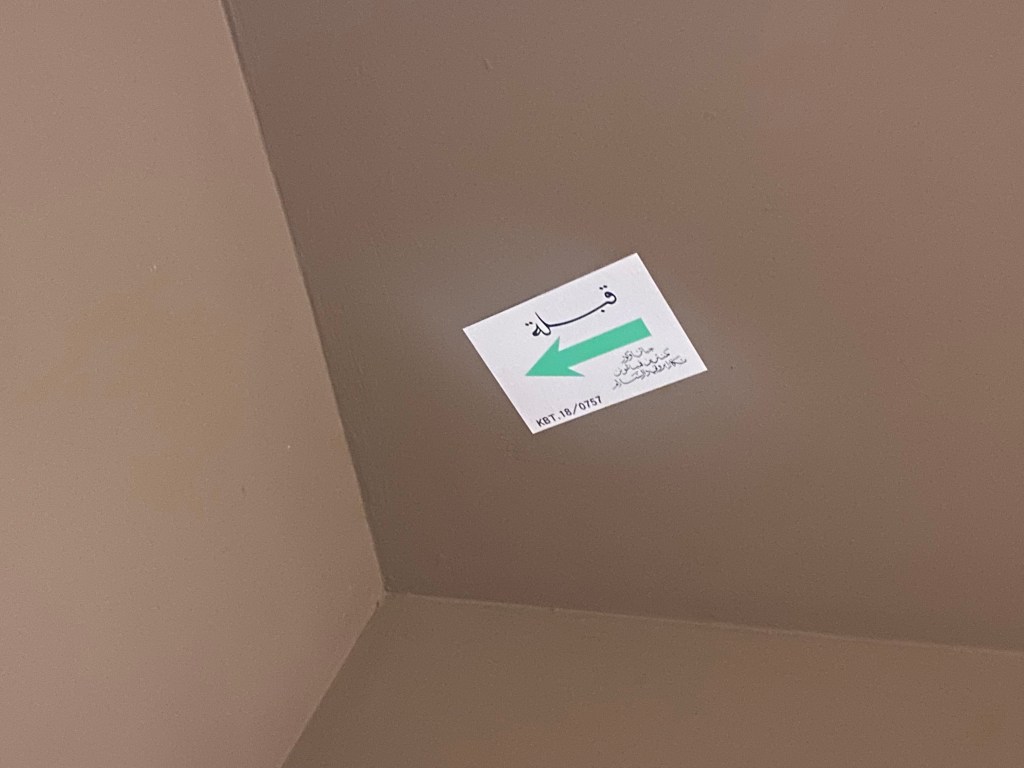 Our room was very big. In the corner was a Qibler pointer that showed the direction to Mecca. Outside, a view over a Youth Center and Ceremonial Hall.
