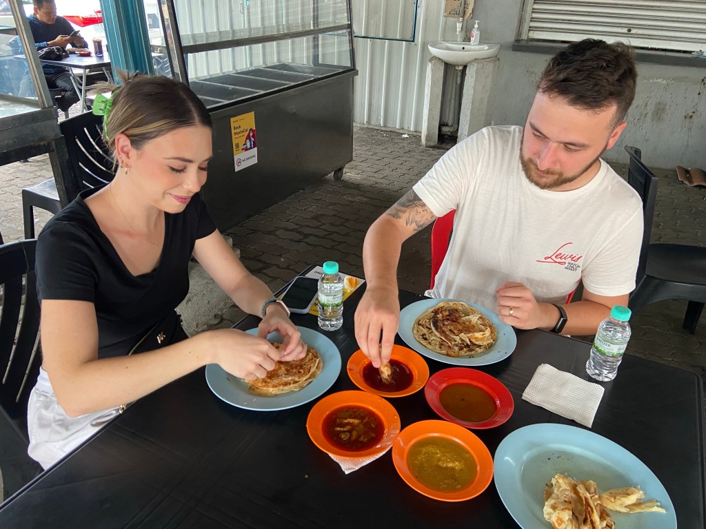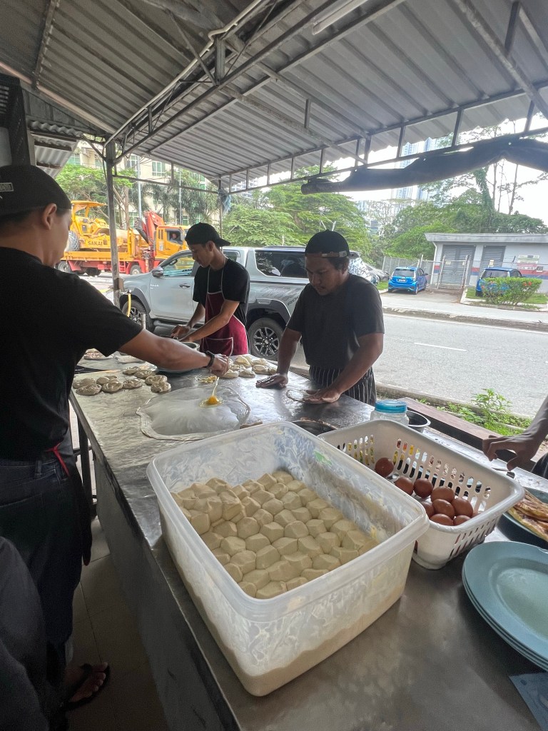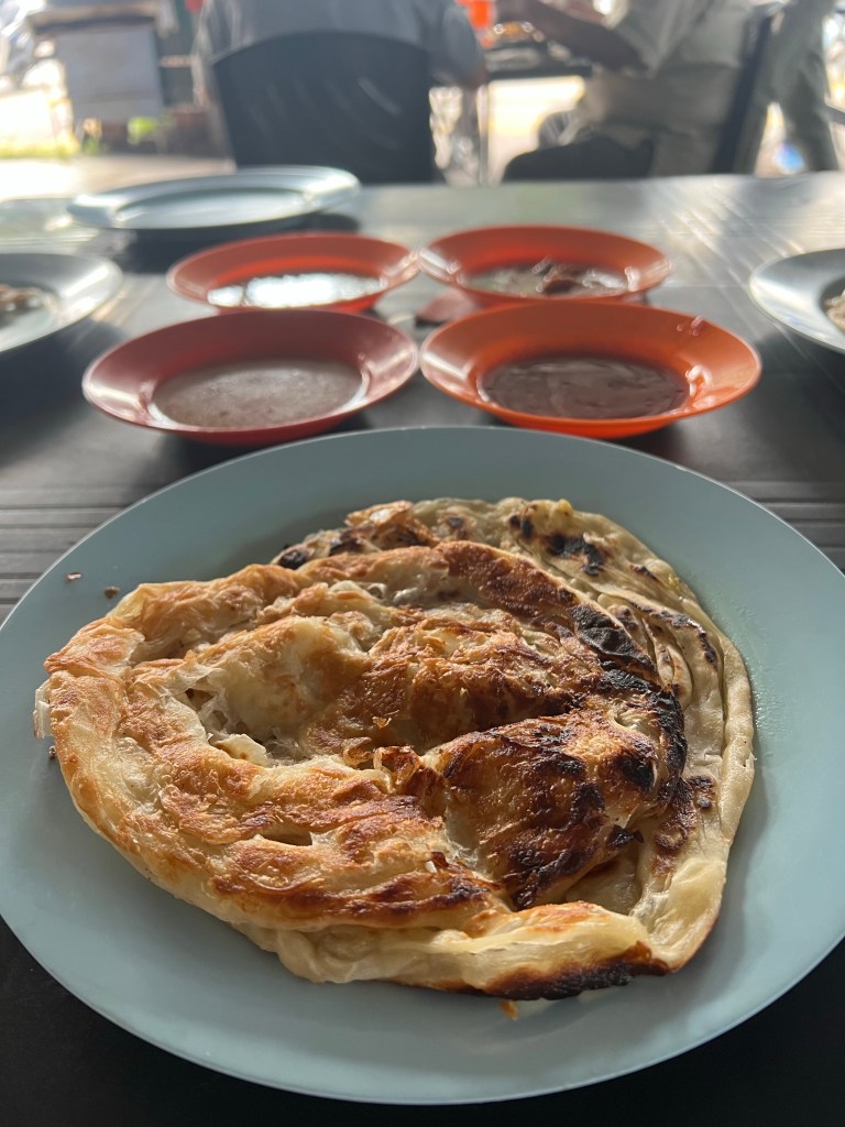 Anyways, our first stop was to try one of Malaysia’s favorite breakfast snacks, Roti Canae. This simple flatbread listed by TasteAtlas as the Best Bread in the World! I had actually found this out in my research and was really excited that it would be our first stop. It was pretty close to the border, about 10 or so minutes. After driving round a small, windy road, we pulled in to a packed dirt lot and walked towards our first location of the day, Warung Roti Canae Bukit Chagar. This place was exactly what we wanted from this trip. It was simply a tin roof over some seats and a table with a couple of guys rolling dough and throwing it on a grill, and there wasn’t another tourist in sight. We were getting the real experience.