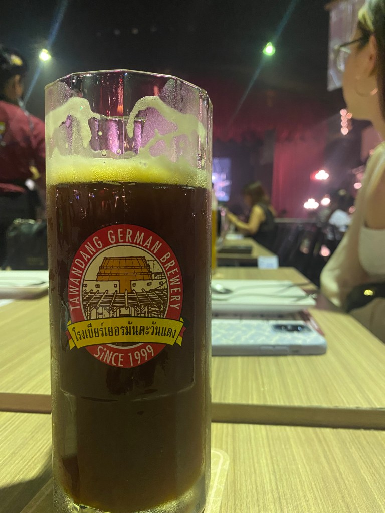 This was Tawandang German Brewery. We pulled in to a gated parking lot in front of, what looked like, a small stadium. Inside was a large open floor with hundreds of tables. At the end, a stage with flashing lights and an excited man dancing and singing.