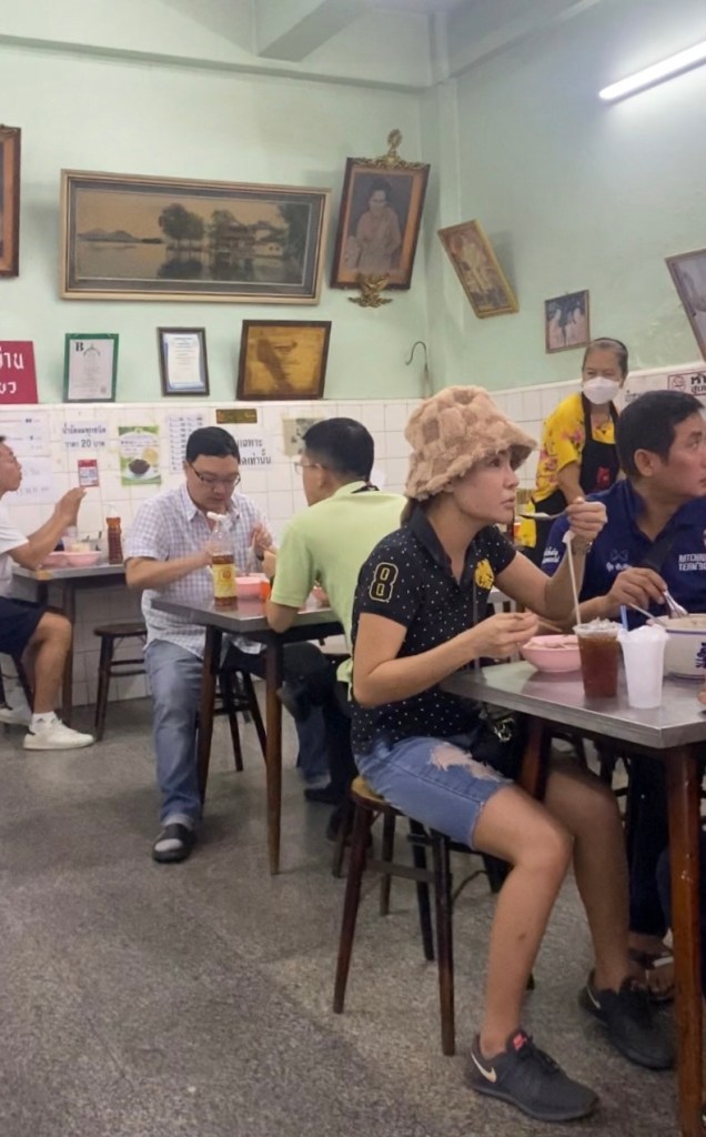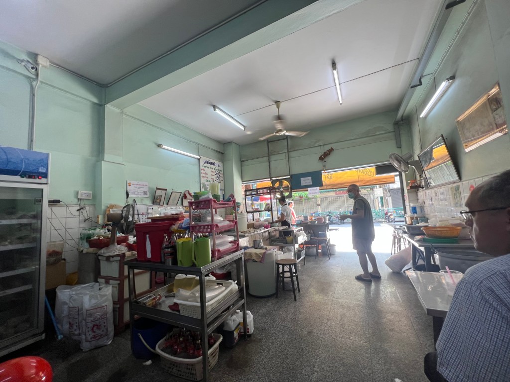 We parked up and walked down the street until Pang pointed out a small hole in the wall, with a baby blue sign. Inside was quite simple. A few tables each with a couple of wooden stools, various carts holding random kitchen utensils, old photos and menus completely in Thai on the walls. A lady walked over and Pang ordered for us. This was definitely the type of place where English wasn’t spoken, and those are the best places to eat.