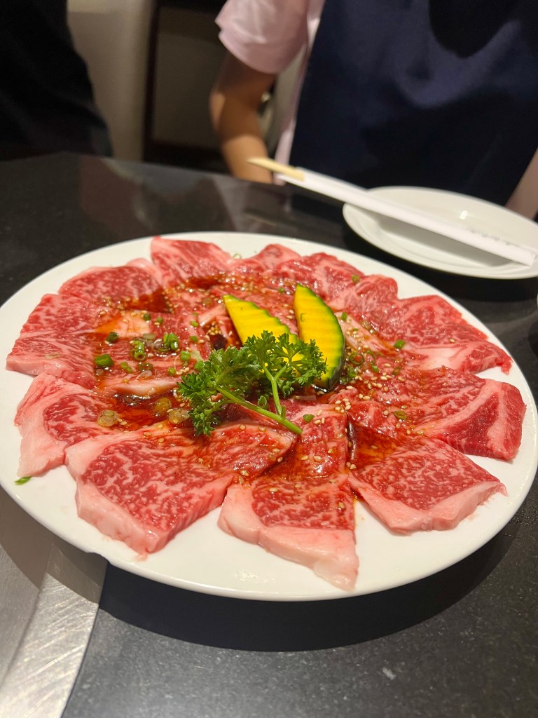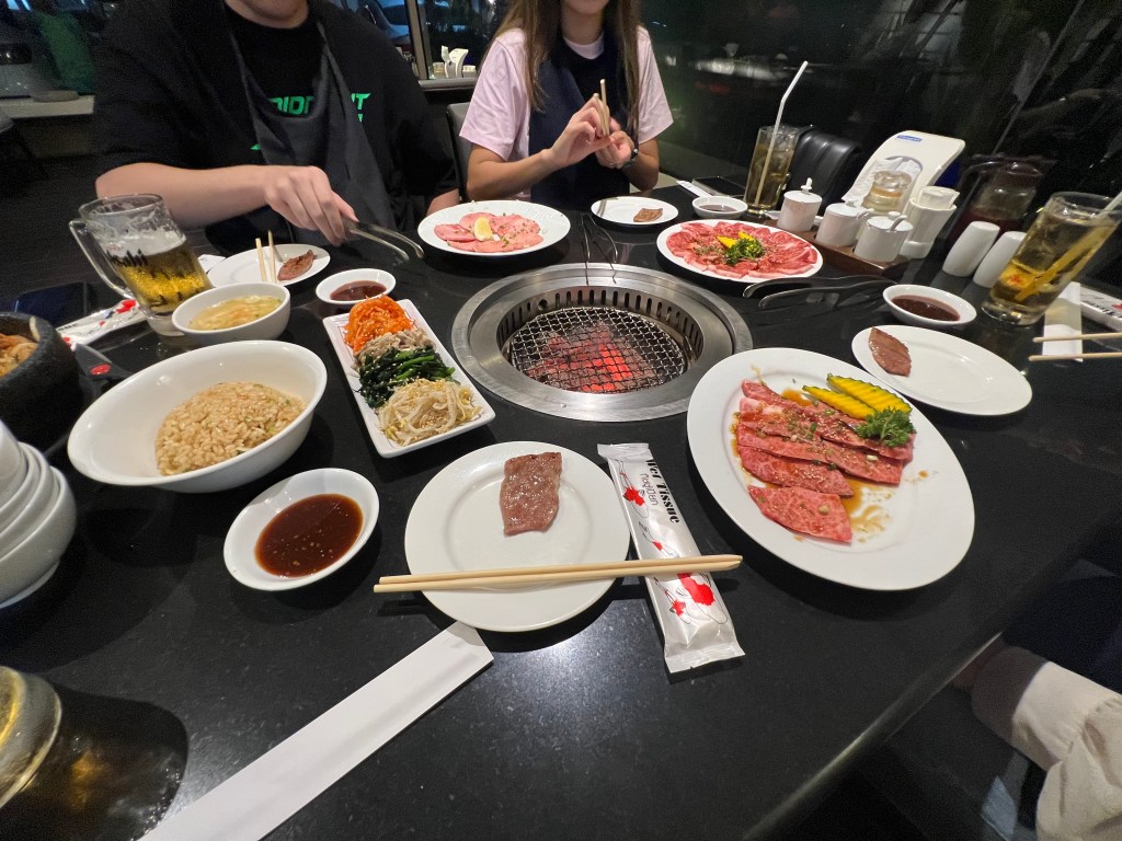 What arrived to our table was heaven. Plates full of incredibly marbled meat, drizzled in light soy. I took my chopsticks, picked up a slice of tongue and dropped it on to the grill. It immediately sizzled. I couldn’t get over the marbling on it. I mean this slice of tongue was completely marbled. It looked like there was more fat than meat, in the best possible way. Mark and Pang manned the grill, and put a slice on everyone’s plate. I took a bite. You wouldn’t have thought it was meat. It was so tender it completely melted in my mouth like butter. The Sirloin was also delicious. Slightly less tender than the tongue, but with a meatier taste.