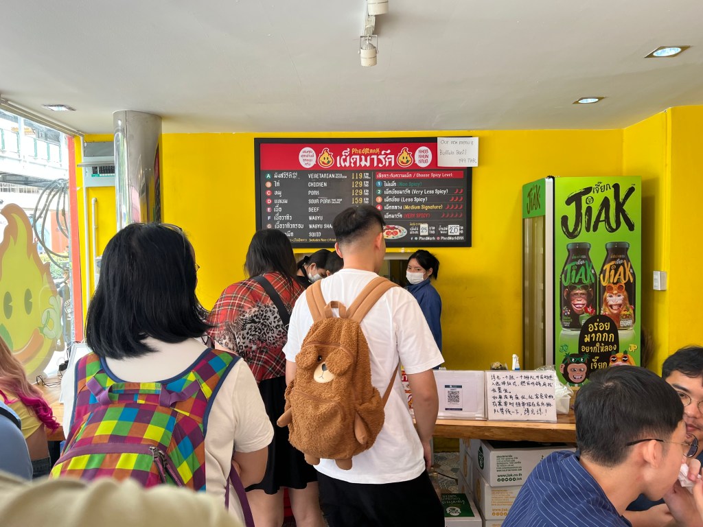 Here they only serve Phat kaphrao (also spelled Pad Krapao), a spicy pork and basil stir fry. It was around midday and the small restaurant was already full and with a line. Ordering is easy, you choose a meat and spice level. That’s it. Out of the 5 levels of spice, we opted for Level 2 (Very Less Spicy). Mark Wiens is known for his love of spice, we knew ‘Very Less Spicy’ really meant ‘Spicy’. For meat, we went for the classic Pad Krapao style, Pork. After ordering, we were given a receipt and told to wait until our number was called. We sat outside on some tiny stools and sweated a little more in the heat.