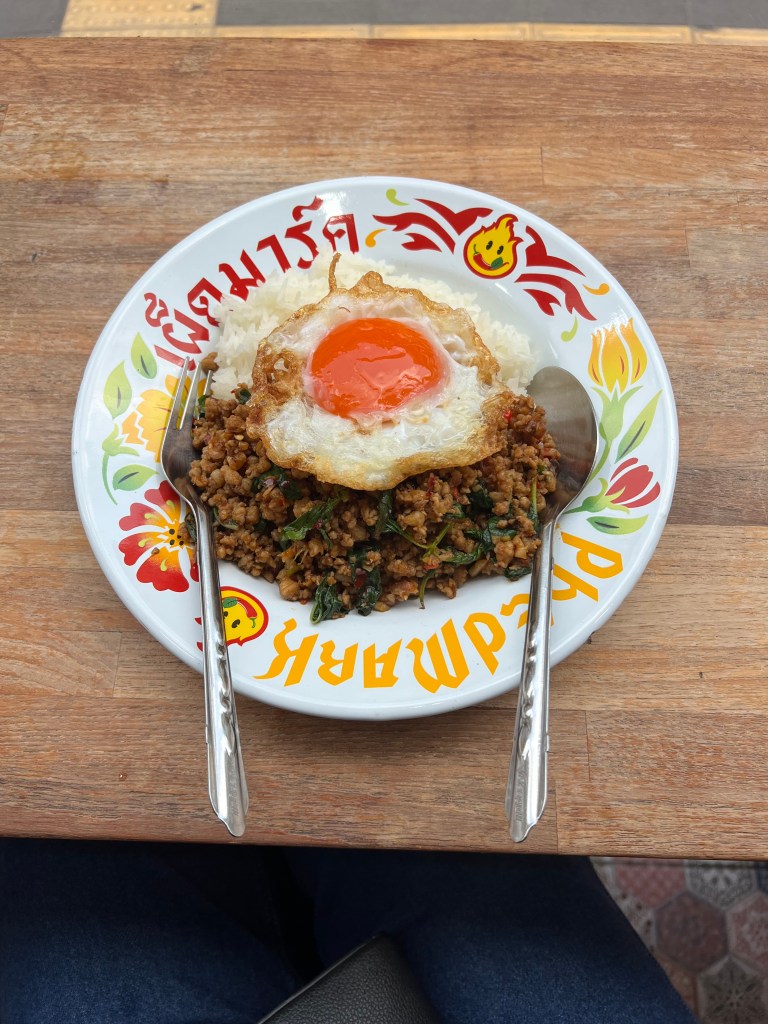 We did what any sane person would do and cut into the yolk. It was perfectly cooked, and the beautiful, orange yolk oozed out all over the pork. I took a spoon and got a bite of everything, the pork, egg, and rice. I felt like Remy from Ratatouille when we mixes the cheese and strawberries. The richness of the yolk, the spice and umami from the pork, the crunch of the basil, and softness of the rice. Everything came together in a perfect blend of flavor. Emily’s eyes lit up and we basked in the tastiness. It definitely was our favorite dish of Thailand so far.
