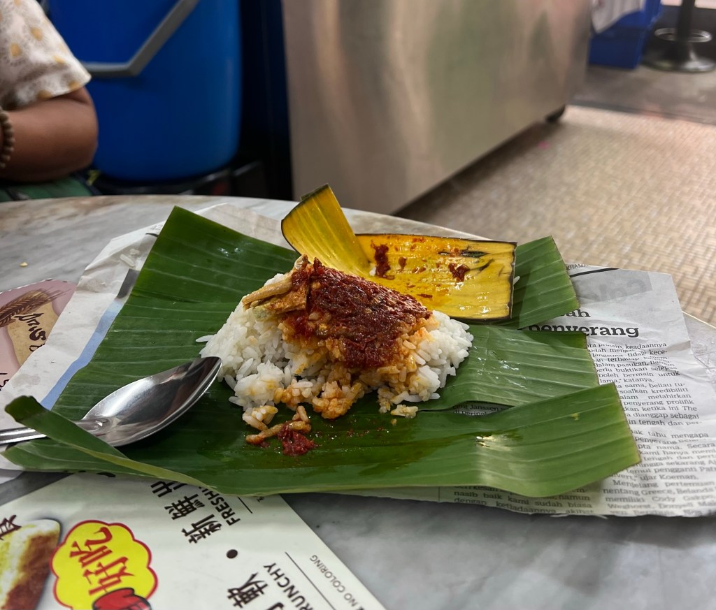 In Johor Bahru, our guide Han led us to Restoran Kin Hua, a bustling little store where we would try Nasi Lemak. We were given a banana leaf, which was folded up like a little gift. After unwrapping and eating the insides, we weren’t too sure of it. Coconut flavored rice, sambal , and anchovies are all strong conflicting flavors that we just couldn’t seem to enjoy. While we can see the potential, this specific one was not for us.